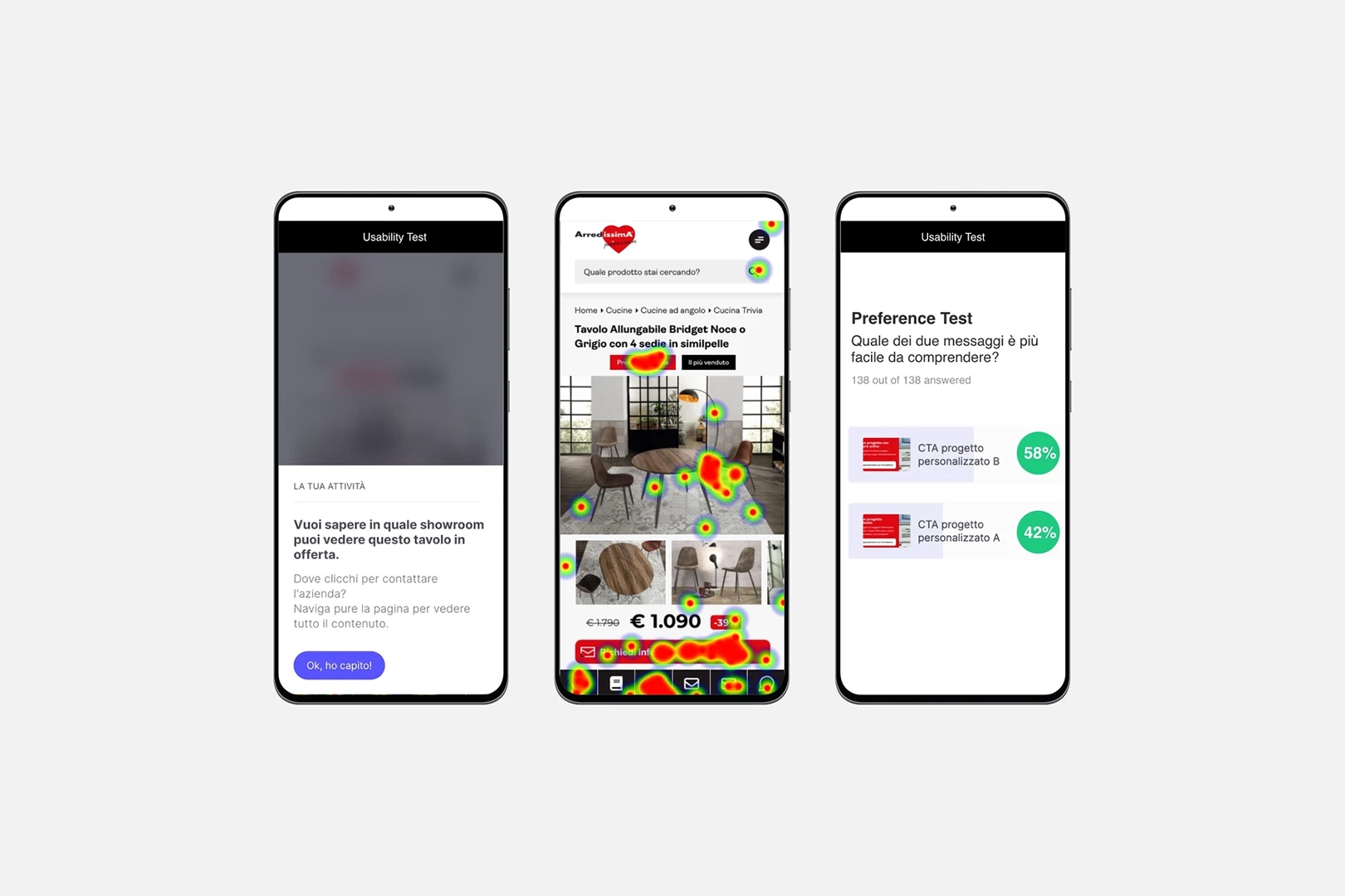 Per la creazione dei prototipi grafici interattivi per mobile e desktop siamo partiti dall’analisi UX e CRO. Attraverso la somministrazione di test qualitativi ad un campione significativo di clienti (individuato insieme al cliente), abbiamo testato l’usabilità delle proposte di grafica e copy utilizzando un tool di User Test. Questo sistema ci ha permesso di verificare:
